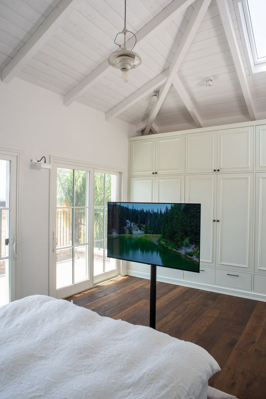 חדר הורים מרווח ונעים בעל תקרת קורות עץ גבוהה צבועה בלבן.